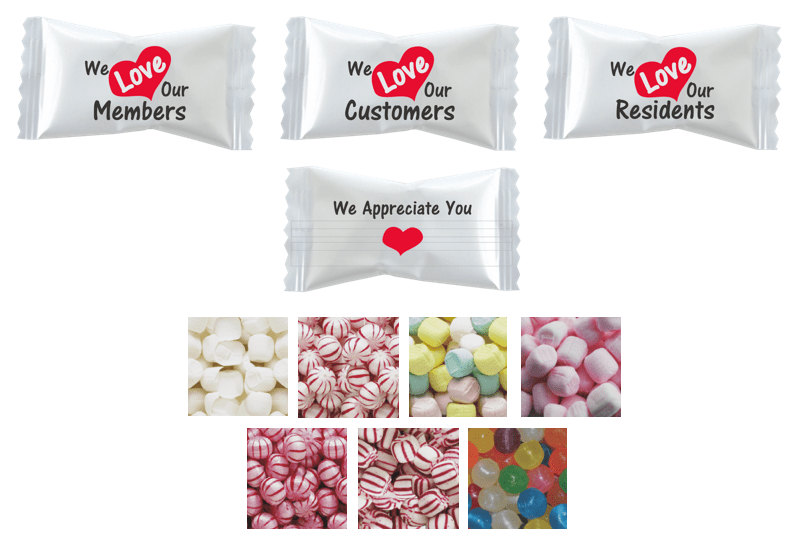 Pick the mint label wrapper that is right for you! Here are the choices: We Love Our Customers We Love Our Members We Love Our Residents Candy Flavors: White Buttermints, Soft Peppermints, Pastel Buttermints, Pink Buttermints, Hard Peppermint Balls, Hard Cinnamon Balls, Assorted Fruit Balls.